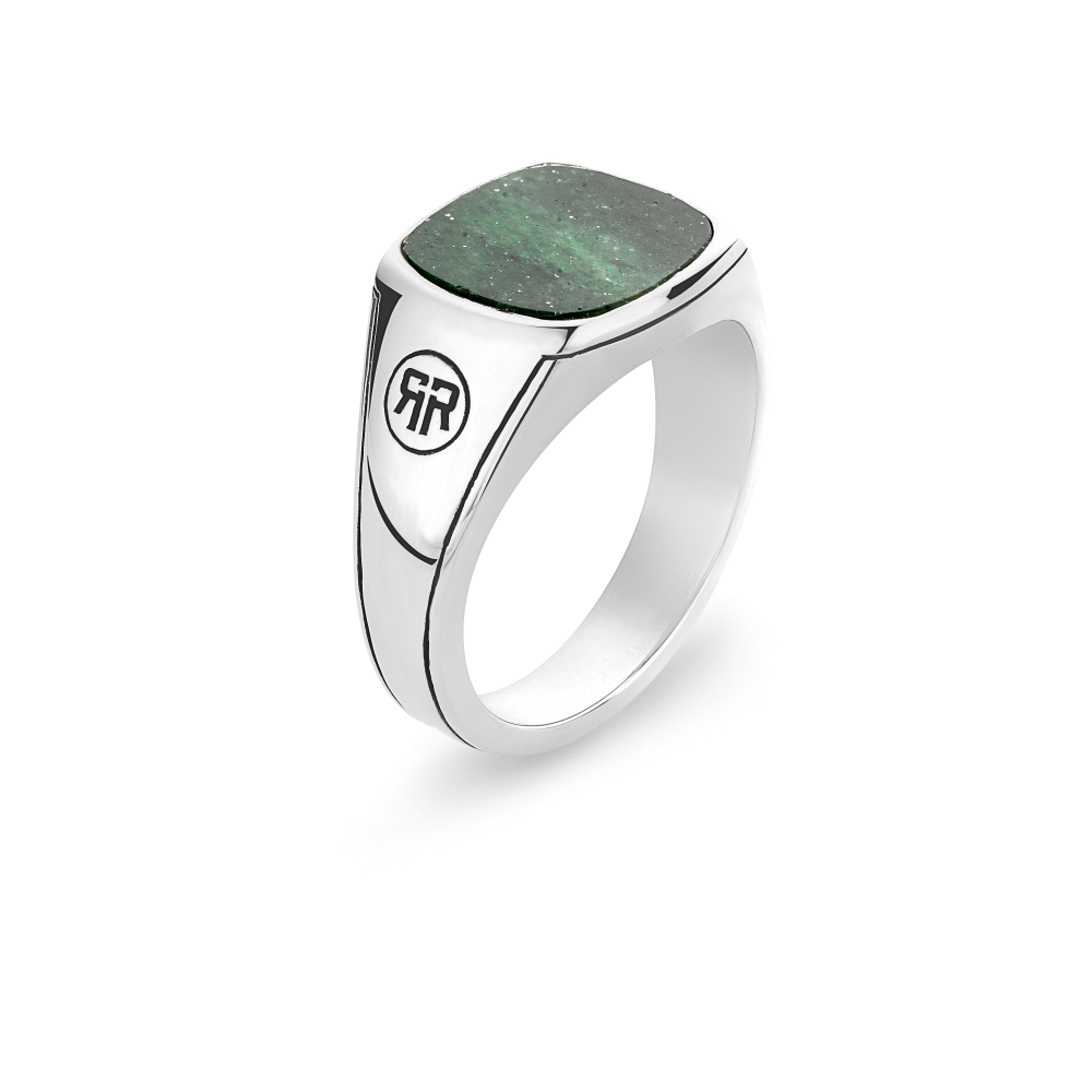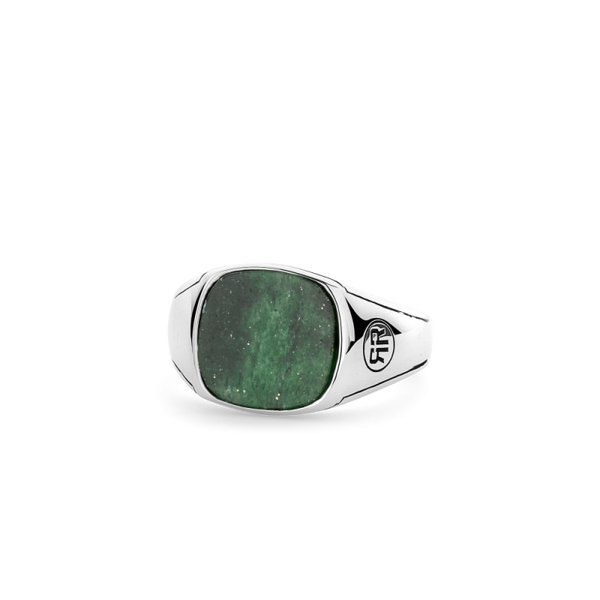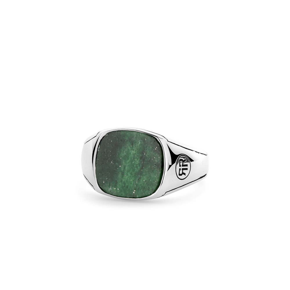 Sterling 925 zilveren zegelring, handgemaakt en met een vierkante groene Jade edelsteen van 12 x 12 mm. Het zilver is glanzend afgewerkt.