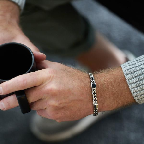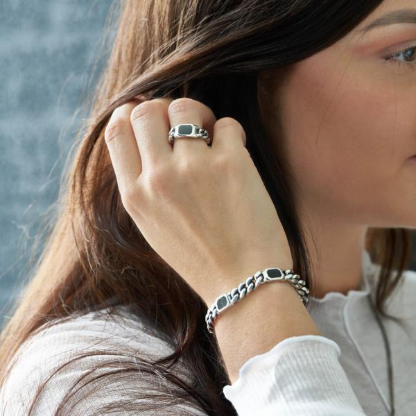 Stoere zilveren schakel armband met zwart resin. De verwerking van de zwart resin / giethars maakt deze handgemaakte zilveren schakel armband opvallend en uniek. De 925 sterling zilveren armband sluit middels een karabijn sluiting, welke eventueel aan de binnenzijde gepersonaliseerd kan worden met een laser gravure. De zilveren armband is onderdeel van een tijdloze stoere doch elegante set.