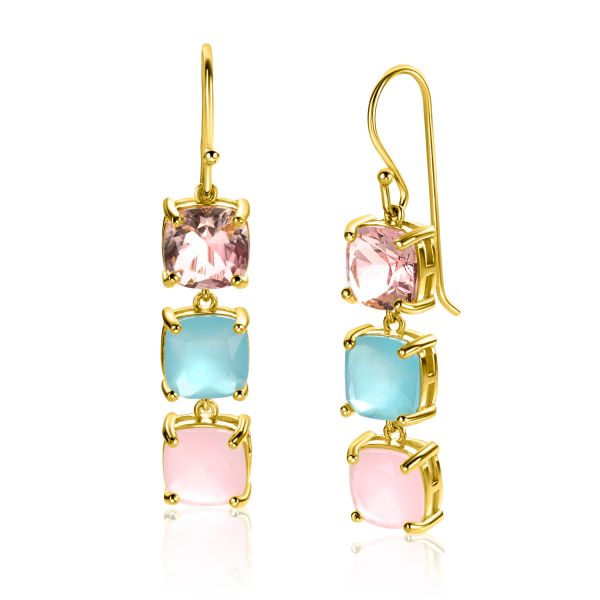 ZINZI gold plated zilveren oorhangers 43mm met drie trendy vierkante kleurstenen in roze en turquoise. De oorhangers zijn vervaardigd van eerste gehalte zilver (925) en extra geelverguld.