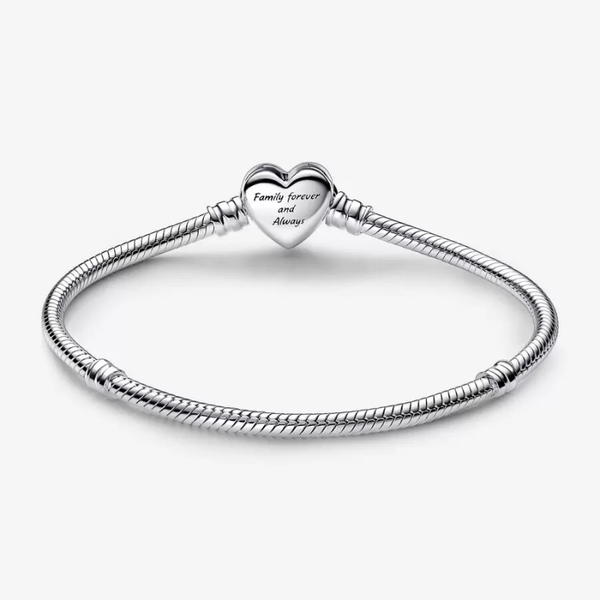 De Pandora Moments Sprankelende Snake Chain Armband met Hartsluiting vertegenwoordigt de eeuwige liefde die familie met elkaar verbindt en is een betekenisvol geschenk voor degenen die voor jou het belangrijkst zijn. De opengewerkte hartsluiting is bezet met stenen langs de rand van het motief en een asymmetrisch oneindigheidssymbool dat om het hart draait. De achterkant van de sluiting is gegraveerd met de boodschap, 'Family forever and Always'. De armband heeft twee schroefdraden (verhoogde bedelverdelers) die hem in drie delen verdelen. Style met maximaal 16-18 van je favoriete bedels of hangende bedels als symbool voor de mensen van wie je houdt, of geef cadeau aan iemand om wie je geeft.