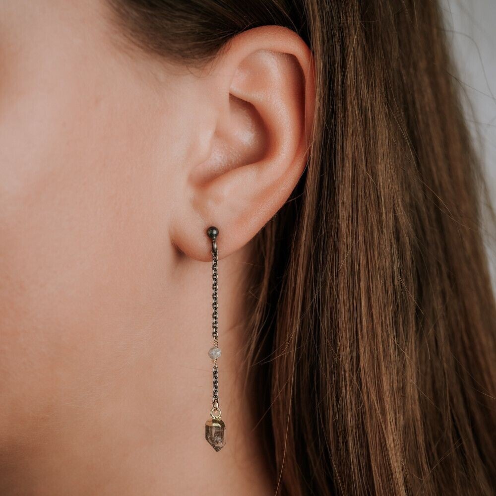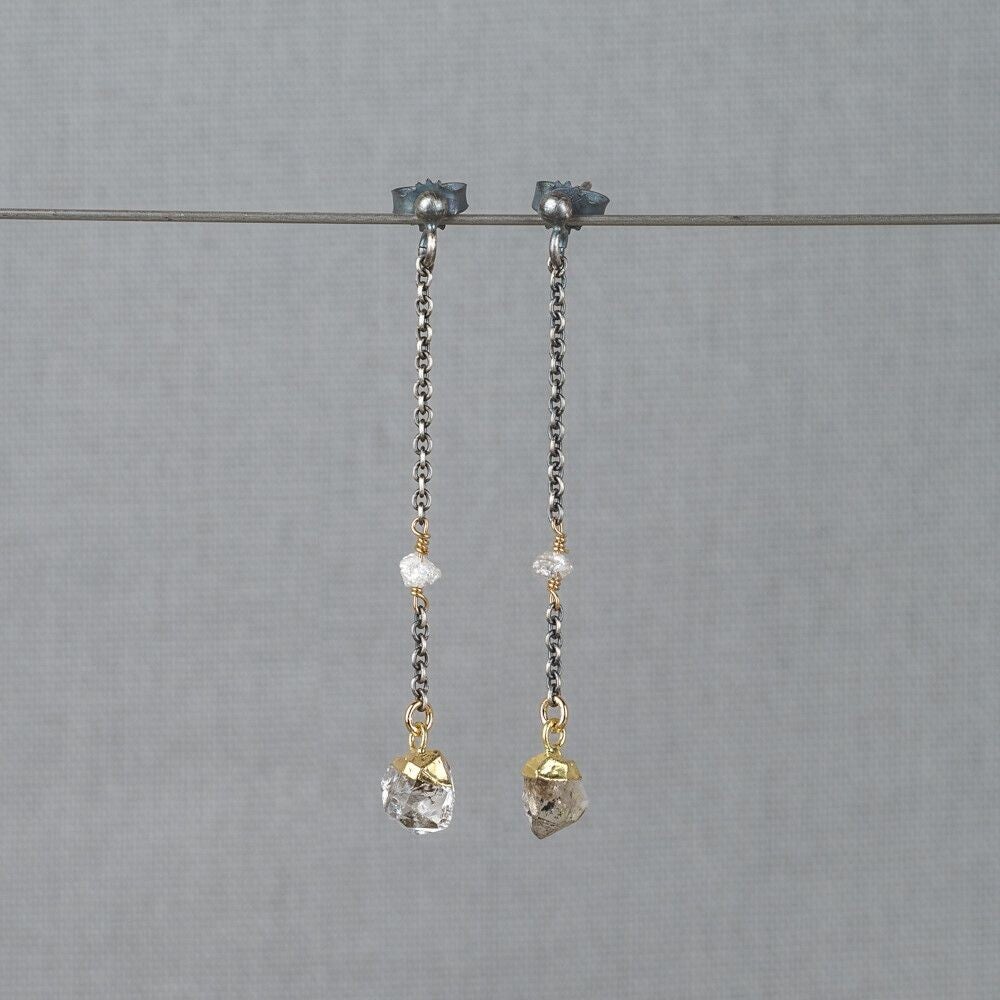 Oorbellen gemaakt van 925 geoxideerd sterling zilver in combinatie met zilver verguld en de edelstenen Ruwe Diamant en Herkimer Diamant.