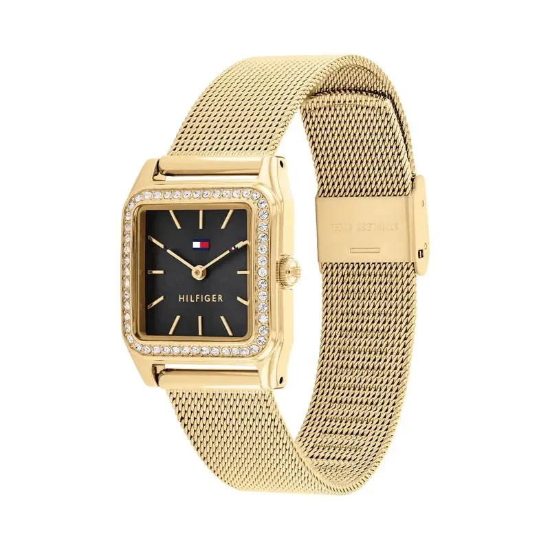 Dit Tommy Hilfiger TH1782611 Toni dameshorloge is voorzien van een goudkleurig wijzerplaat die is afgedekt met mineraalglas. Het horloge heeft een vierkante goudkleurige kast met een bezel vol bezet met kristallen en een zwarte wijzerplaat. Aan de stijlvolle kast zit een goudkleurige milanese band met een druksluiting. De band is op lengte verstelbaar. Het horloge heeft een diameter van 26 mm en is 3 ATM waterdicht.