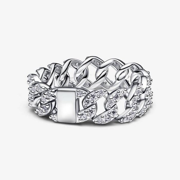 Deze sterlingzilveren ring met pavé en Cubaanse schakel geeft elegantie een nieuwe betekenis met zijn 84 ronde, briljantgeslepen heldere zirkonia's in kraalzetting. Hij heeft een verfijnd schakelmotief en is afgewerkt met een pavé van drie stenen op elke halve cirkel van de schakel, voor een oogverblindende glans. De gepolijste achterkant zorgt voor draagcomfort, terwijl het platte logo een vleugje verfijning geeft. Combineer hem met je favoriete avondoutfit of een strak pak voor een verfijnde, elegante look.