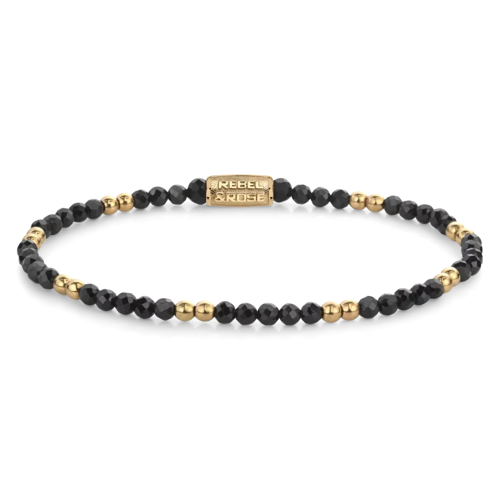 Bead armband met 3mm Black Spinel stenen, en 3mm 18 karaat goud ion-plated edelstalen stenen. De sluiting is gemaakt van 18 karaat goud ion-plated edelstaal. Het Rebel & Rose sieraad is handgemaakt en makkelijk te combineren met onze andere kralenarmbanden.