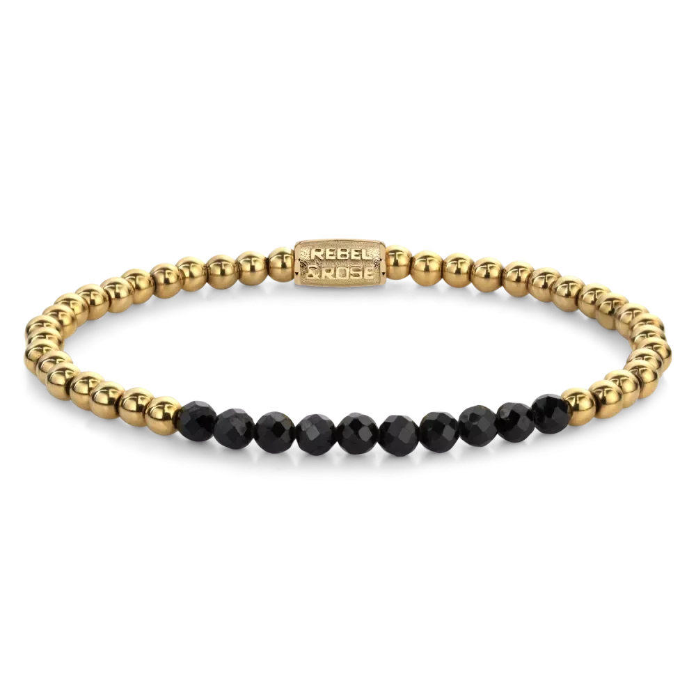 Bead armband met tien 4mm Black Spinel stenen, en 4mm 18 karaat goud ion-plated edelstalen stenen. De sluiting is gemaakt van 18 karaat goud ion-plated edelstaal. Het Rebel & Rose sieraad is handgemaakt en makkelijk te combineren met onze andere kralenarmbanden.
