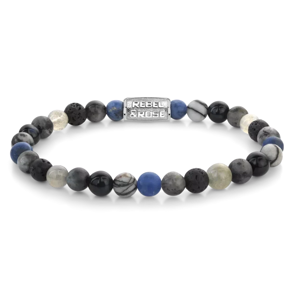 Bead armband, handgemaakt van 6mm Sodaliet Blauw, Agaat (Black Network), Tijgeroog Blauw, Larvakiet Grijs, Labradoriet en Lava stenen met een zilverkleurige sluiting. De Rebel & Rose sieraden zijn makkelijk te combineren met andere zilveren, leren of kralenarmbanden.