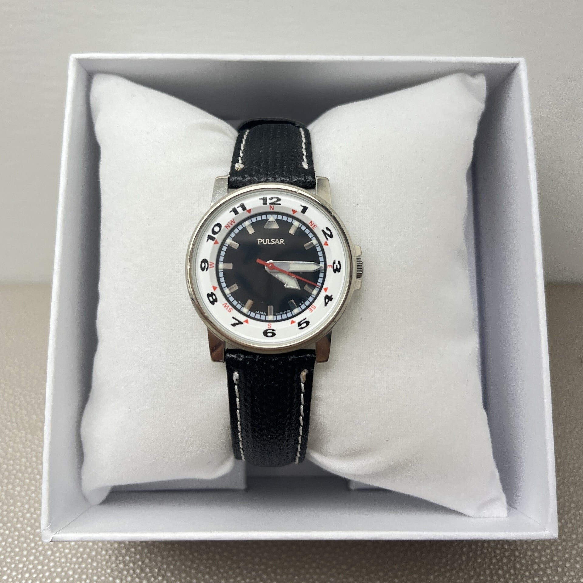 Vintage klein model van Pulsar. Kan ook voor een heer eventueel. Zwart/rood/witte wijzerplaat.
