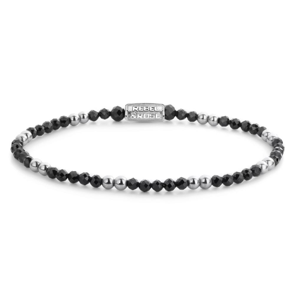 Bead armband met 3mm Black Spinel stenen, en 3mm hematiet stenen. De sluiting is gemaakt van zilverkleurig edelstaal. Het Rebel & Rose sieraad is handgemaakt en makkelijk te combineren met onze andere kralenarmbanden.