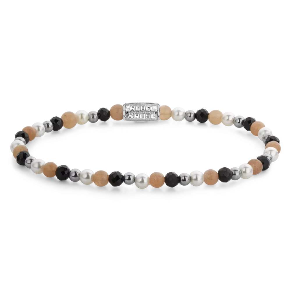 Bead armband, handgemaakt van 4mm stenen (Black Spinel, parels, Zonnesteen, Hematiet) met een edelstalen sluiting. Het Rebel & Rose sieraad is makkelijk te combineren met onze andere kralenarmbanden.