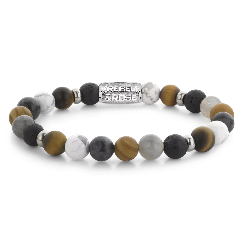 Bead armband, handgemaakt van 8mm stenen (Tijgeroog, Lava, Labradoriet, Grain Stone, Larvakiet, Howliet en kleine Stainless Steel elementen) met een zilverkleurige sluiting. De Rebel & Rose sieraden zijn makkelijk te combineren met andere zilveren, leren of kralenarmbanden.