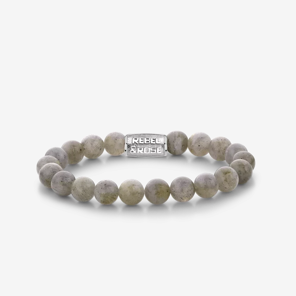 Bead armband, handgemaakt van 8mm Labradoriet stenen met een edelstalen sluiting.Het Rebel & Rose sieraad is makkelijk te combineren met andere zilveren, leren of kralenarmbanden.