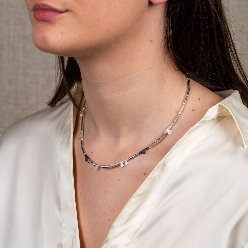Collier gemaakt van 925 sterling zilveren en geoxideerde buisjes. Aan sommige buisjes zitten ronde deeltjes van hetzelfde materiaal. Combineer met een paar mooie oorbellen, een ring en armband voor een complete look!