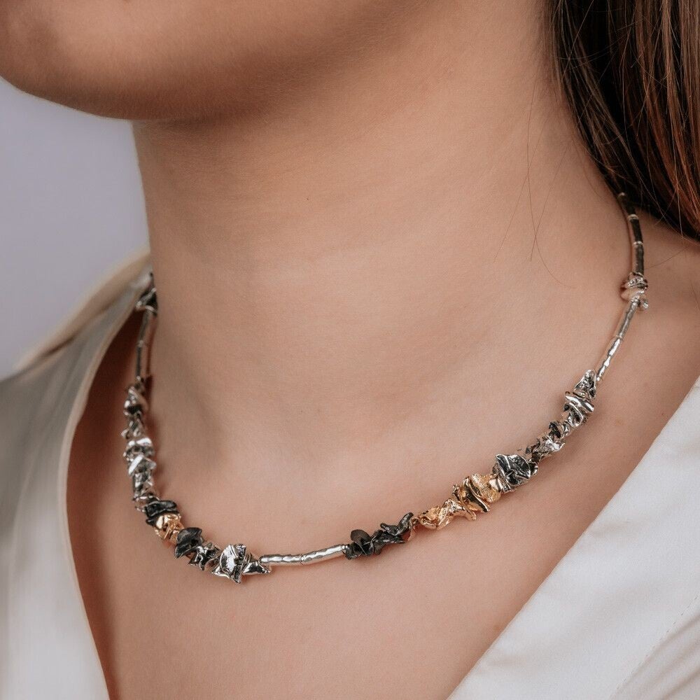 Collier gemaakt van 925 sterling zilveren buisjes in combinatie met zilver, geoxideerd zilver en zilver verguld. Combineer dit collier met een armband, een paar oorbellen en een ring voor een complete look!