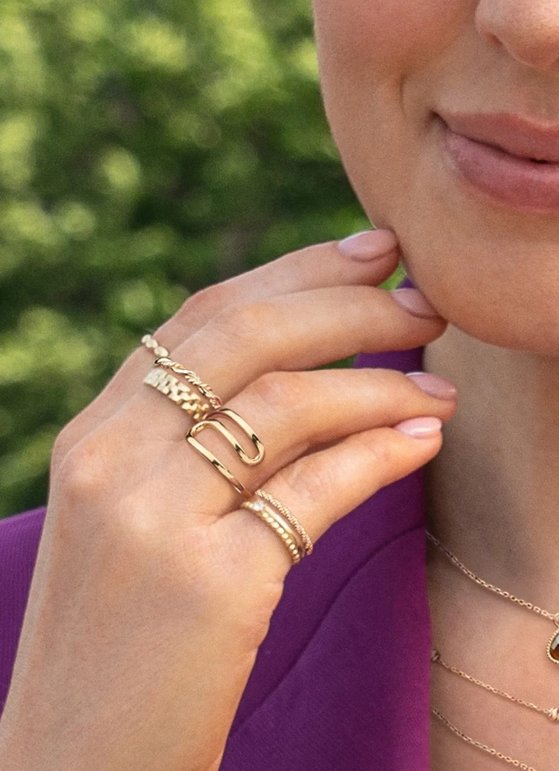Geïnspireerd op de sierlijke lijnen van de Amsterdamse grachtengordel. Deze ring is uniek door het dubbele draagontwerp. Organisch, opvallend en veelzijdig net als de stad zelf. Een subtiele blikvanger van 14 karaat goud.
