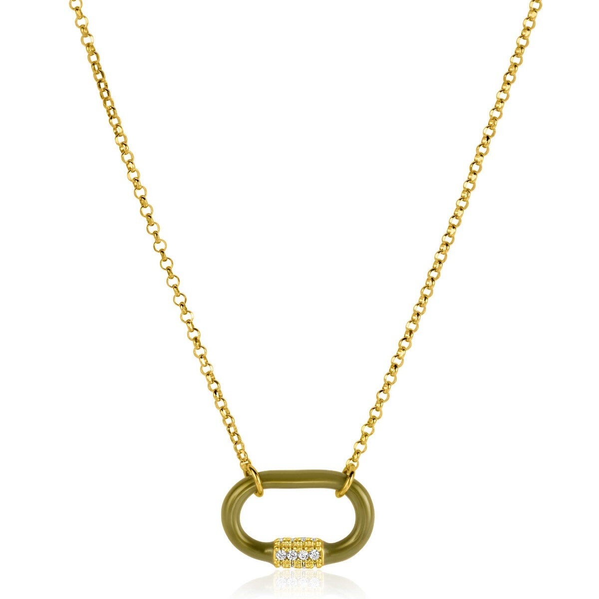 ZINZI gold plated zilveren schakelketting 45cm met ovale hanger in olijfgroen emaille en bezet met witte zirconia's. De lengte van de ketting is te variëren tussen 40cm en 45cm. Vervaardigd van eerste gehalte zilver (925) en voorzien van een extra 14K geel vergulding.