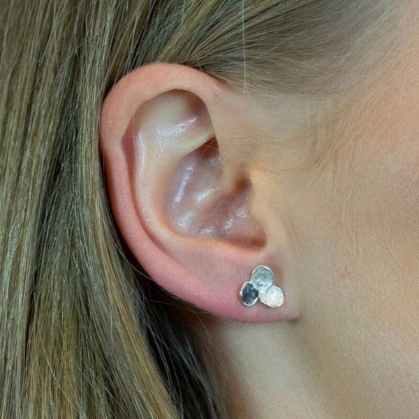 Oorbel gemaakt van 925 sterling zilver en geoxideerd zilver in de vorm van een klavertje 3.