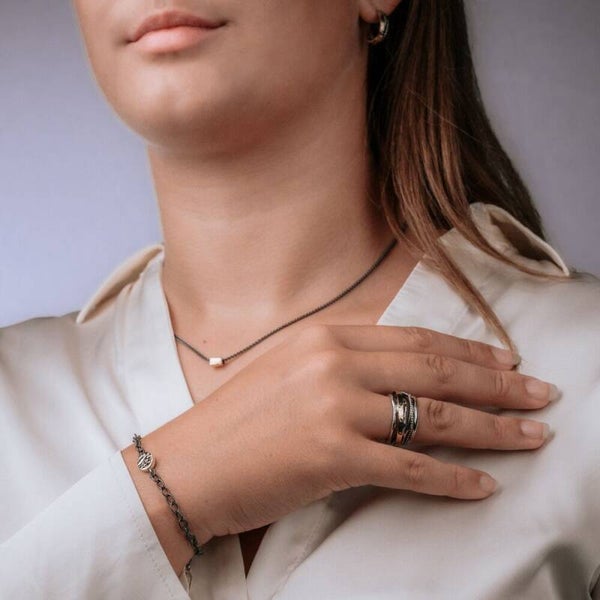 Armband gemaakt van 925 geoxideerd sterling zilver in combinatie met een 9 karaat ovaaltje. Combineer met een collier, ring en oorbellen voor een complete look! Dit armbanje kun je op verschillende lengtes dragen dankzij de schakels. De maximale lengte is 19 cm.