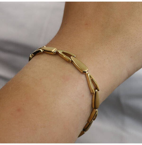 Deze prachtige damesarmband van Boccia Titanium is goudkleurig en deels gematteerd en deels glanzend. De armband is 20cm lang.
