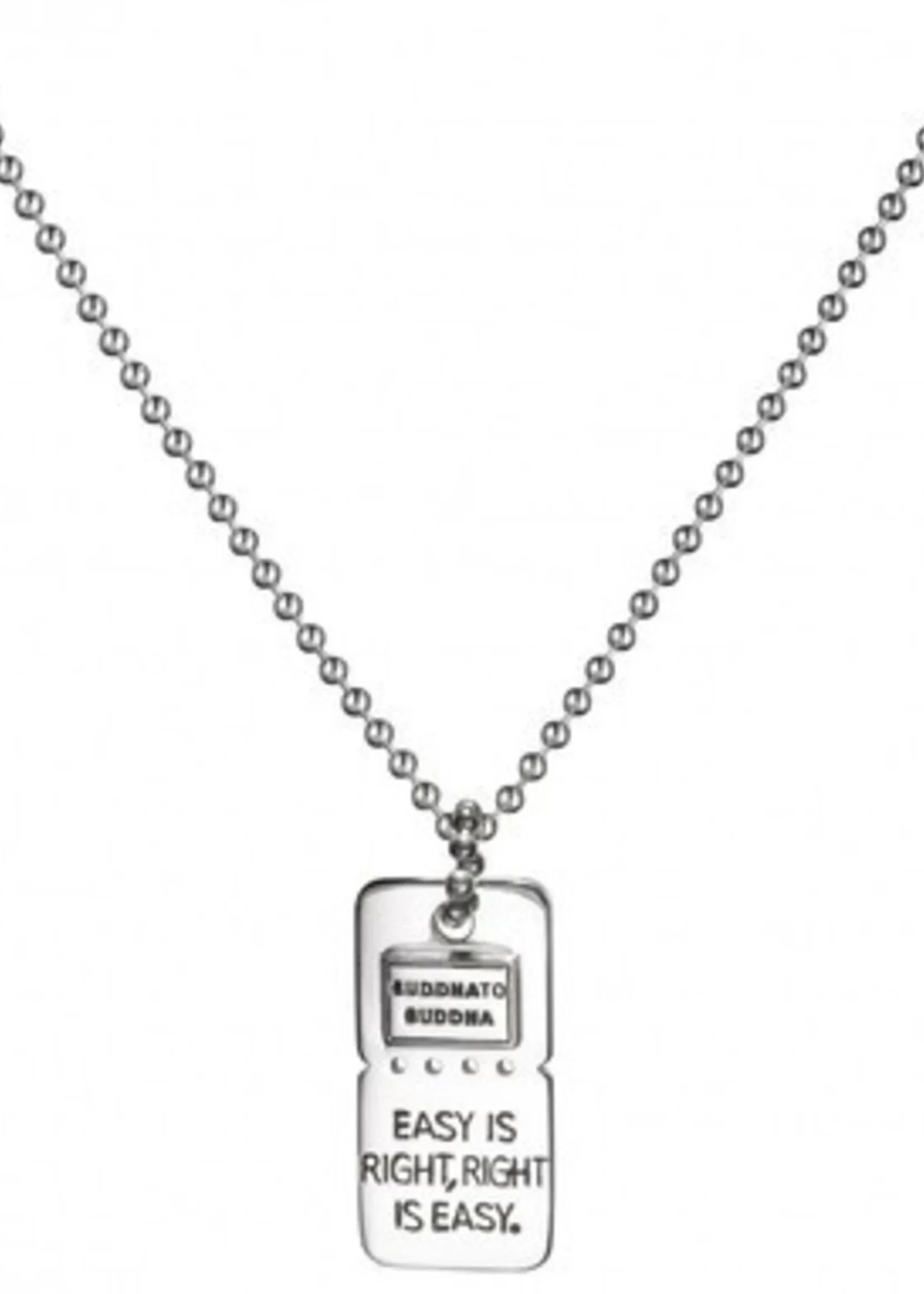 De hanger Easy met leren collier van Buddha to Buddha bestaat uit een zilveren collier met daaraan een rechthoekige hanger met de tekst easy is right, right is easy.