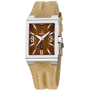 Uniek Festina Horloge met een rechthoekige kast en leren band.