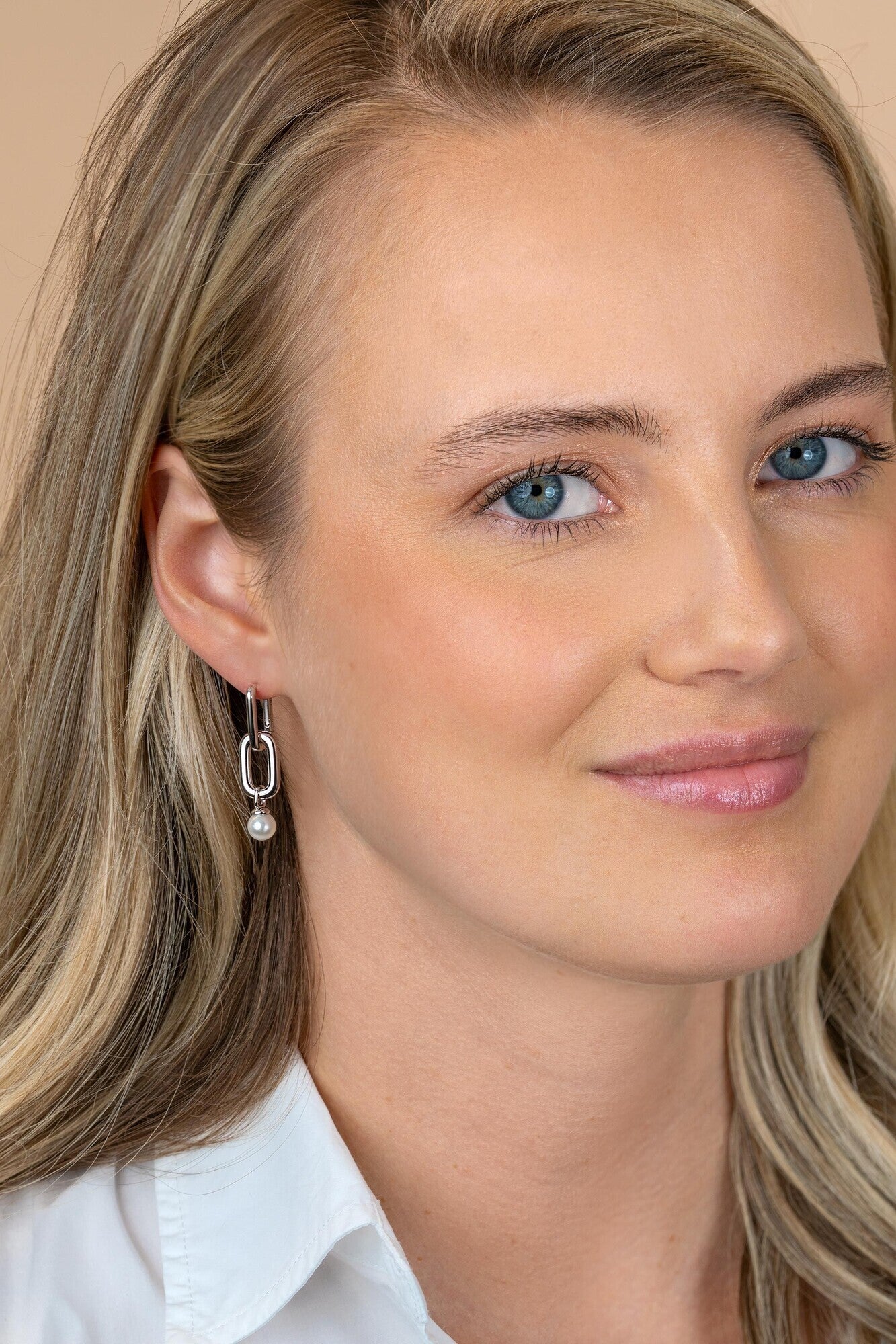 ZINZI zilveren oorbedels met een langwerpige stoere schakel (23mm) en een bungelende witte parel (6mm). De oorbedels zijn vervaardigd van eerste gehalte zilver (925) en voorzien van een extra rodiumlaag voor een langdurige glans.