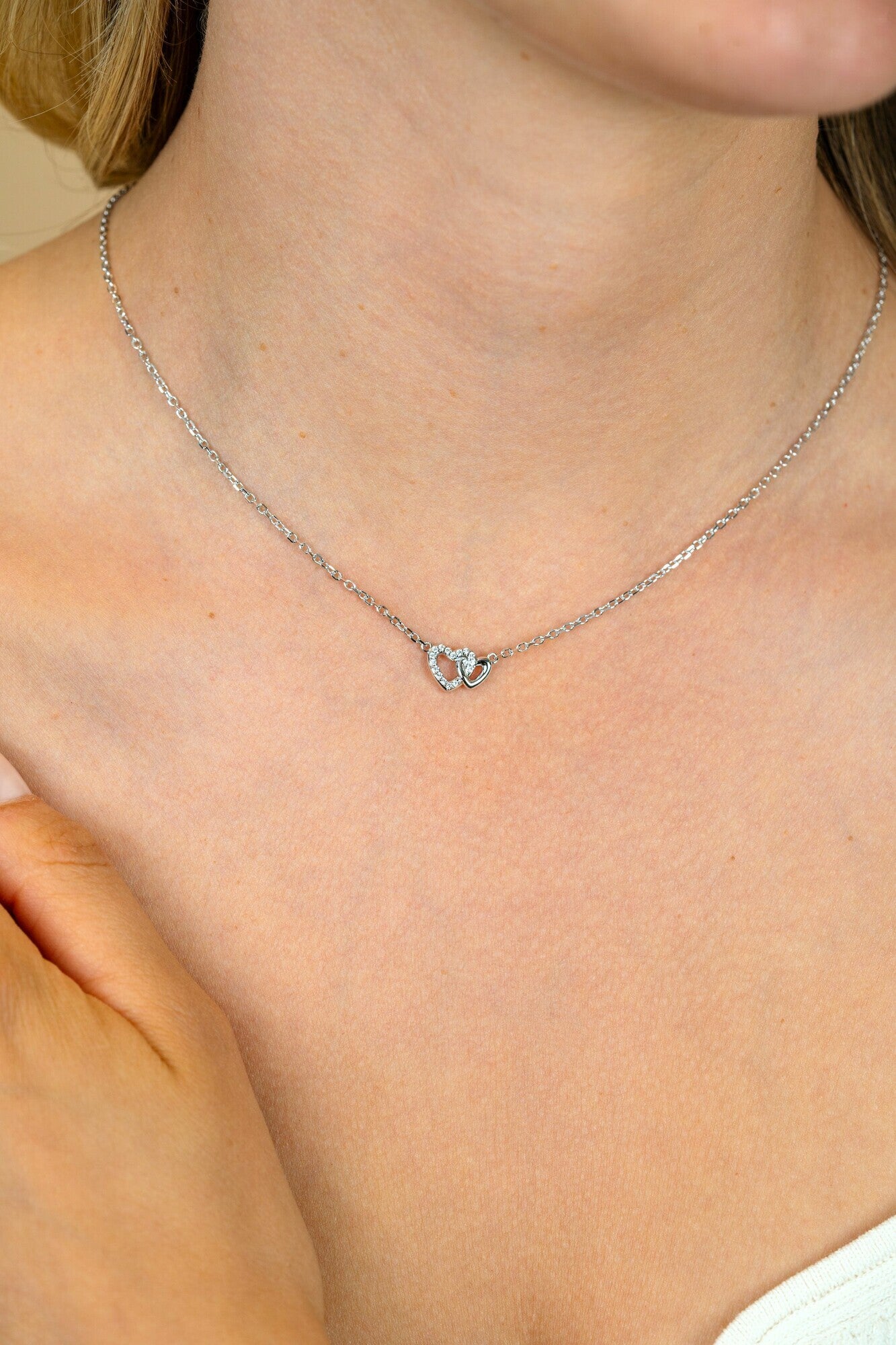 ZINZI zilveren ketting (42-45cm) met twee verbonden hartjes, waarvan één schitterend bezet is met witte zirkonia's. De lengte is verstelbaar tussen 42cm en 45cm. Vervaardigd van eerste gehalte zilver (925) en extra gerodineerd.