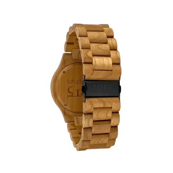 Het horloge is vakkundig vervaardigd uit elegant kersenhout, een houtsoort die bekend staat om zijn warme uitstraling en fijne textuur. Deze keuze voor kersenhout geeft het horloge niet alleen een natuurlijke charme, maar zorgt ook voor een lichte en comfortabele draagervaring. De grote mineraalglazen wijzerplaat, omringd door een dunne lunet, versterkt de visuele impact van het horloge, waardoor het groter en indrukwekkender lijkt.
