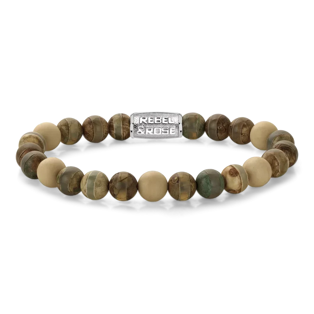 Bead armband, handgemaakt van 8mm Agaat en Fossil stenen met een zilverkleurige edelstalen sluiting. Het Rebel & Rose sieraad is makkelijk te combineren met andere zilveren, leren of kralenarmbanden.