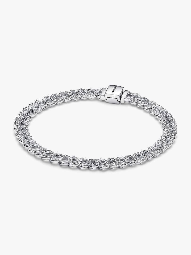 Geef je look een boost met de Pandora Timeless Cuban schakelarmband met pavé. Deze sterlingzilveren armband is gemaakt van sprankelende schakels. De bovenkant van elke halve cirkel is bezet met drie ronde stenen, terwijl