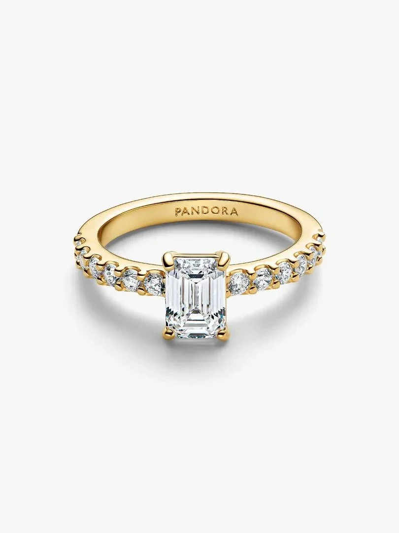 Tot in de puntjes geslepen. Deze vergulde ring heeft een verhoogde heldere steen en een halve pavé band. Het perfecte item voor elke outfit.
