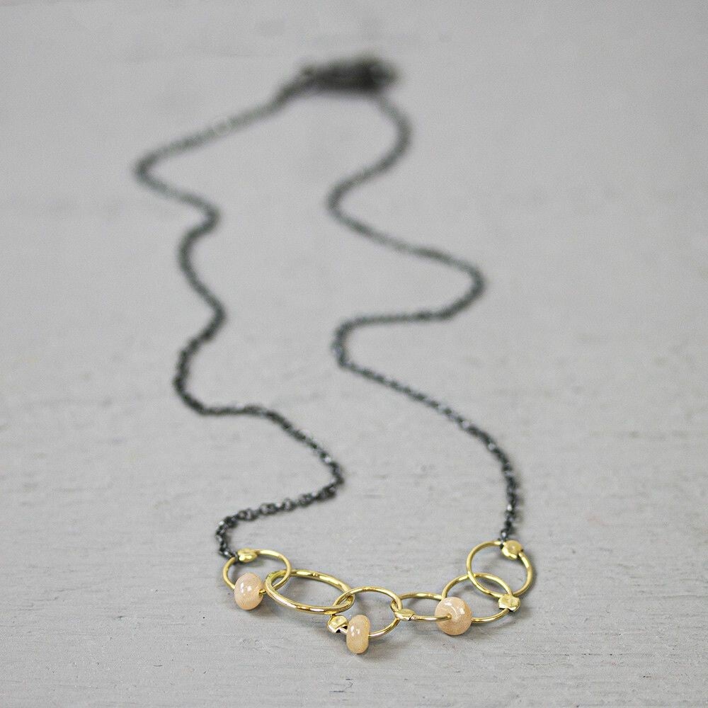 Collier gemaakt van 925 geoxideerd sterling zilver met daaraan cirkels van goldfilled. Aan deze cirkels zitten stukjes roze maansteen.
