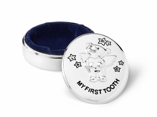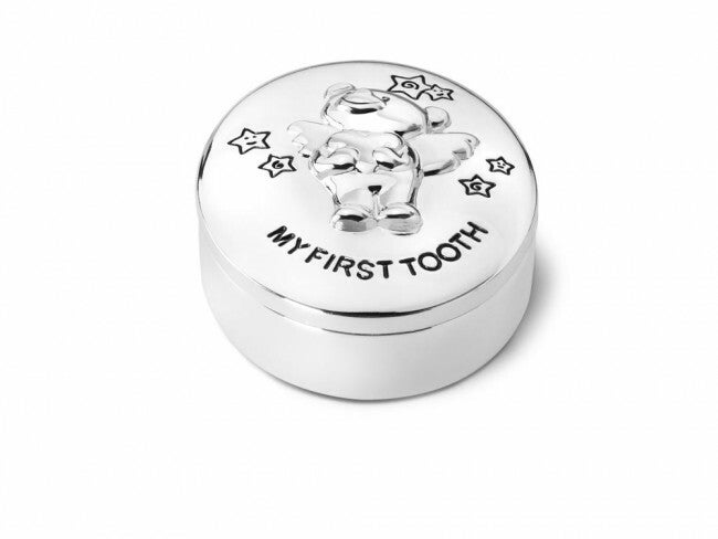 Ovalen tandendoosje met de afbeelding van een beertje en sterretjes en de inscriptie 'My first tooth'. Blauw velours binnenzijde. Dit doosje kan gegraveerd worden, wat het een persoonlijk geschenk maakt en is verzilverd en gelakt, waardoor poetsen overbodig is. Afmetingen 55x45x20mm.
