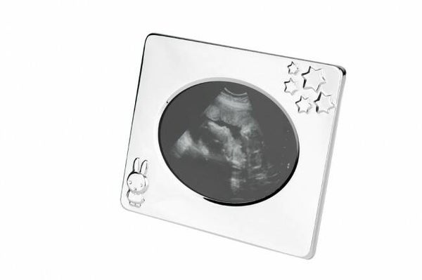 Glanzend lijstje voor echofoto's met nijntje en sterretjes op de rand. De fotolijst is verzilverd en gelakt, waardoor poetsen overbodig is. Afmetingen 64x130x96mm.