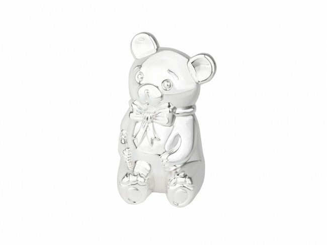 Spaarpot van een beer met een strik. Door het grote formaat van 20 cm passen er veel spaarcenten in de spaarpot. De spaarpot is verzilverd en gelakt, waardoor poetsen overbodig is. De spaarpot kan gegraveerd worden, wat het een persoonlijk (geboorte)cadeau maakt.