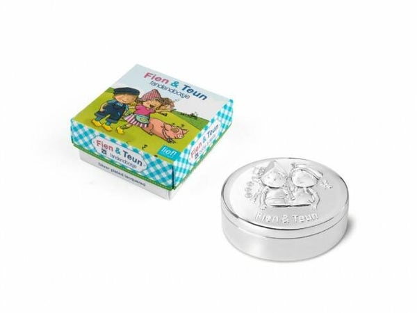 Fien & Teun maken de leukste avonturen mee op de boerderij. Sebastiaan het varken, Meneer Beer, de kippen en de koeien zijn hun grootste vriendjes. Fien & Teun zijn onderdeel van lief! lifestyle. Dit tandendoosje met de afbeelding van Fien & Teun is verzilverd gelakt! Het tandendoosje kan gegraveerd worden, wat het een persoonlijk geschenk maakt. Afmetingen 45x55x22mm.