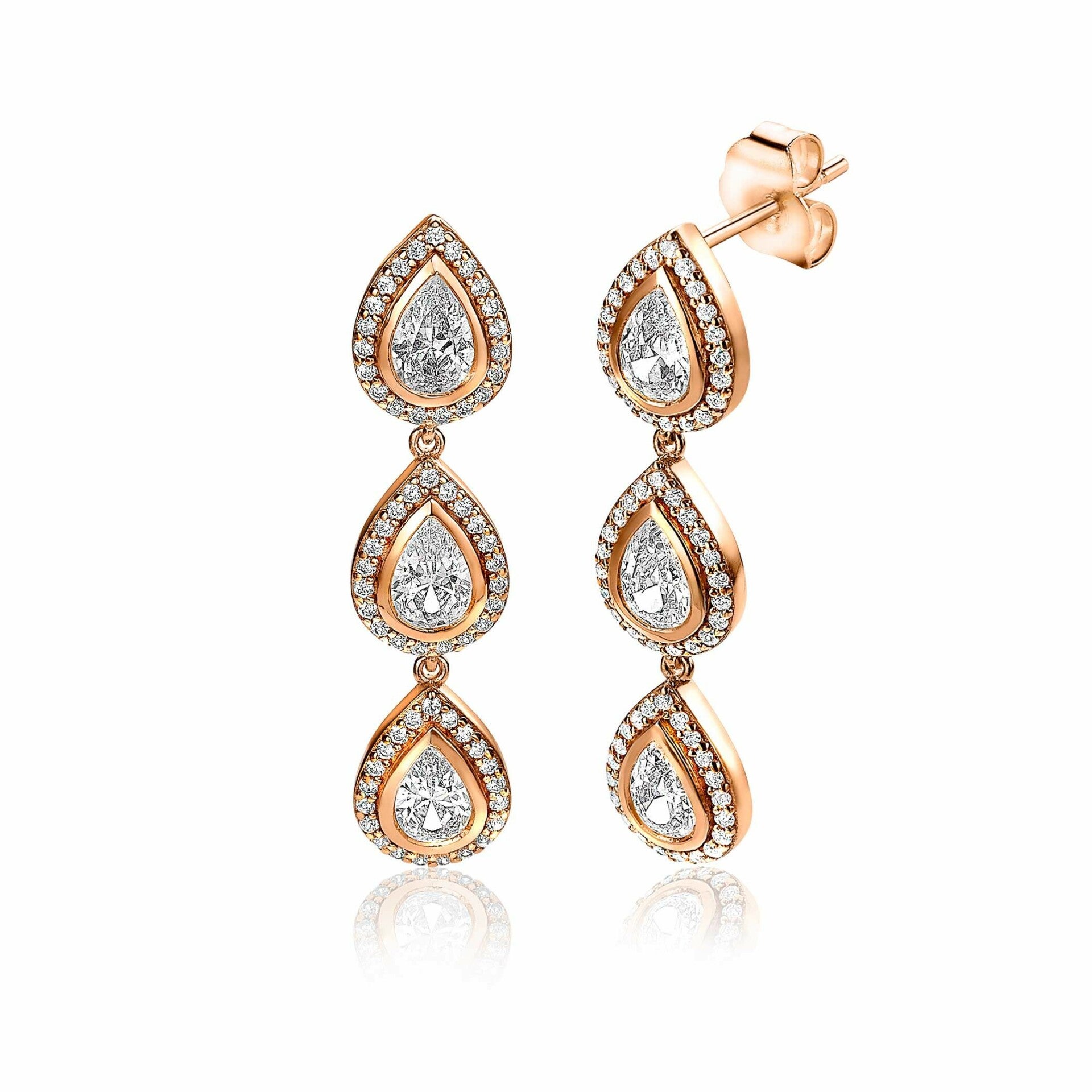 ZINZI zilveren oorsieraden rosé verguld met drie druppelvormen sierlijk bungelend onder elkaar. Elke druppelvorm is in het midden bezet met een grote witte zirconia en de rand met kleinere witte zirconia's. De oorsieraden zijn 35mm lang. Vervaardigd van eerste gehalte zilver (925) en voorzien van een extra rosé vergulding.