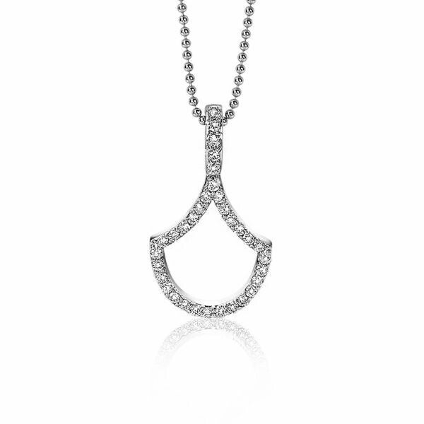 ZINZI zilveren hanger 28mm met een open fantasie vorm, sierlijk bezet met witte zirconia's. Het luxe hangoog heeft een clip-sluiting, waardoor het heel gemakkelijk aan een ketting is te hangen. Maak je eigen combinatie met een bijpassende ketting. De hanger is exclusief collier geprijsd. Vervaardigd van eerste gehalte zilver (925) en voorzien van een extra rodiumlaag voor langdurige glans.