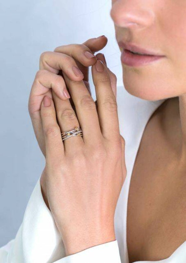 ZINZI zilveren luxe bicolor cross-over ring. Met een breedte van 8,5mm. Een mooie combinatie van gladde banen, een baan bezet met witte zirconia's en drie geelvergulde ronde zettingen bezet met witte zirconia's. Vervaardigd van eerste gehalte zilver (925) en extra 14K geelverguld.