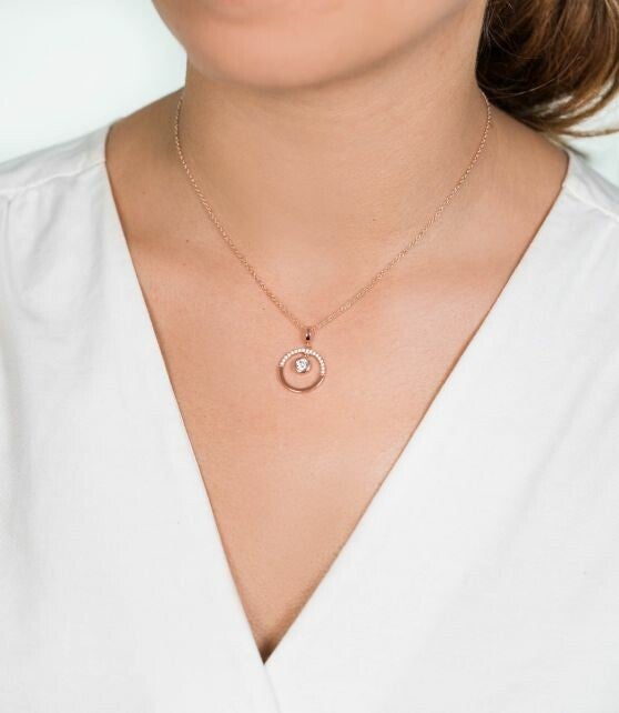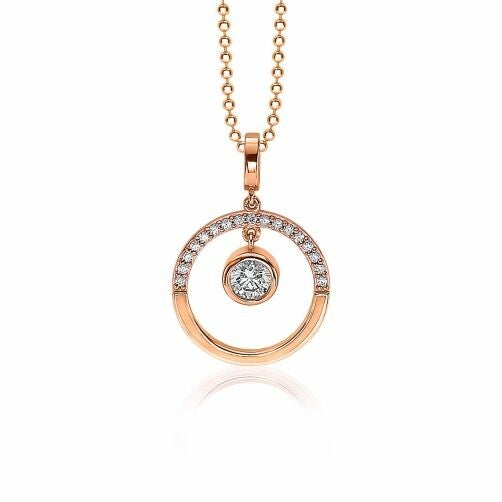 ZINZI zilveren hanger rosé verguld [18mm] met open ronde vorm, waarvan de bovenste helft sierlijk bezet is met witte zirconia's. In het midden hangt een mooie ronde zetting met een witte zirconia. Vervaardigd van eerste gehalte zilver (925) en extra rosé verguld. De hanger is exclusief collier geprijsd.