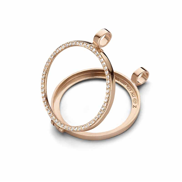 Het MY iMenso medaillon (hanger) kan je eenvoudig openen om zo de insignia’s te wisselen. Het medaillon Grande is 33mm en is vervaardigd van 925 Sterling zilver met een hoogwaardige afwerking (ook wel “Italian finish” genoemd). Het medallion is voorzien van een duurzame 14k roségoud plating en is in de rand bezet met zirkonia's.