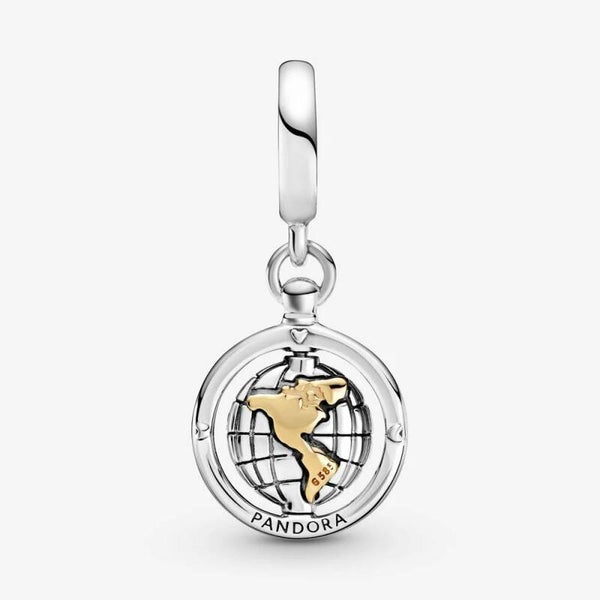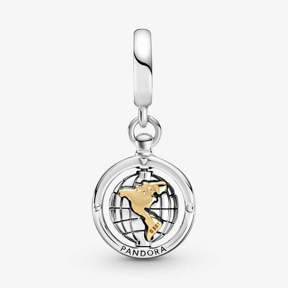 Geef de liefde van je leven de Spinning World Dangle Charm. Dit design dat is hand-finished in sterlingzilver, bestaat uit een platte draaiende globe in een rond frame met een sprankelende steen op de hanger. De continenten van de wereld en de gegraveerde lengte- en breedtegraadlijnen zijn met de hand afgewerkt in 14k goud. Het frame heeft kleine opgeheven hartjes en de gravure, “You mean the world to me” op de voorkant en het Pandora-logo op de achterkant. Laat zien dat jouw liefde verder gaat dan het heelal.
