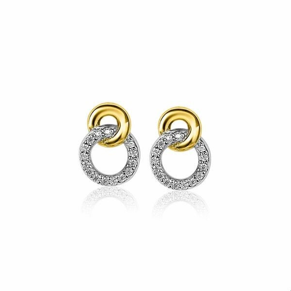 ZINZI zilveren oorstekers met twee verbonden open rondjes, waarvan de bovenste extra geel verguld is en de onderste iets groter is en bezet is met witte zirconia's. Deze oorstekers zijn stijlvol en elegant bij elke outfit! De oorstekers hebben een afmeting van 11mm. Vervaardigd van eerste gehalte zilver (925) en extra 14K geelverguld.