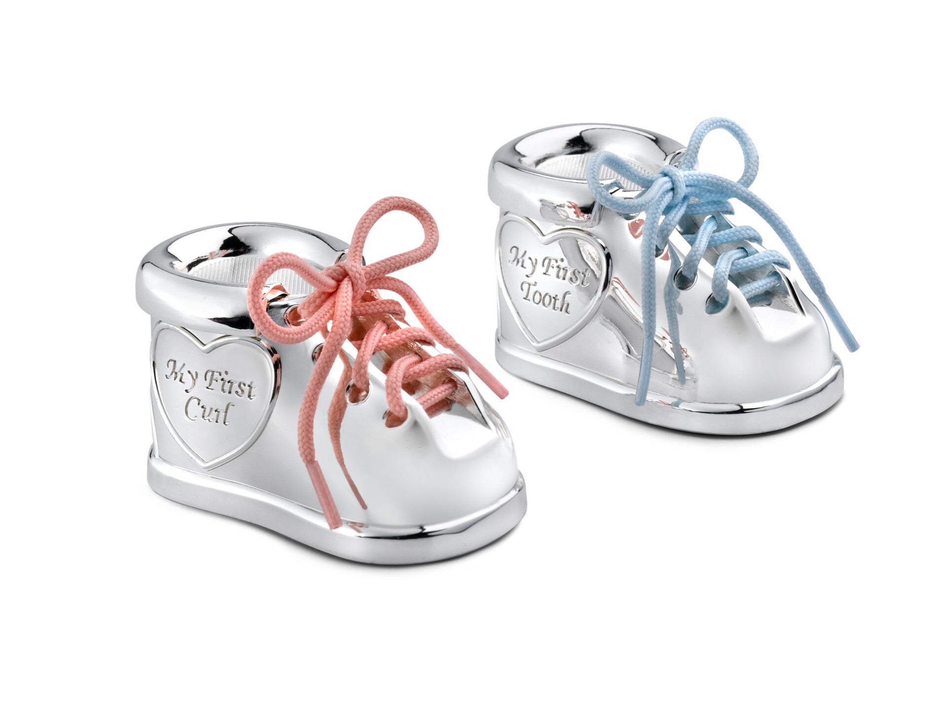Set van twee tanden- en haarlokdoosjes in de vorm van schoentjes, met roze en blauwe veters. De tanden- en haarlokdoosjes zijn in zilver kleur, poetsen is overbodig. De doosjes kunnen gegraveerd worden, wat het een persoonlijk (geboorte)cadeau maakt.