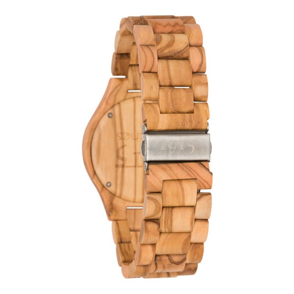 De combinatie van het karakteristieke olijfhout, met de strakke wijzerplaat van geborsteld aluminium geeft het horloge een serene uitstraling. Welke brutaal wordt gebroken door de fel gekleurde secondewijze. Deze worden weer aangedreven door een Zwitsers uurwerk. Op de kop van het kroontje is een olijfblad gegraveerd.