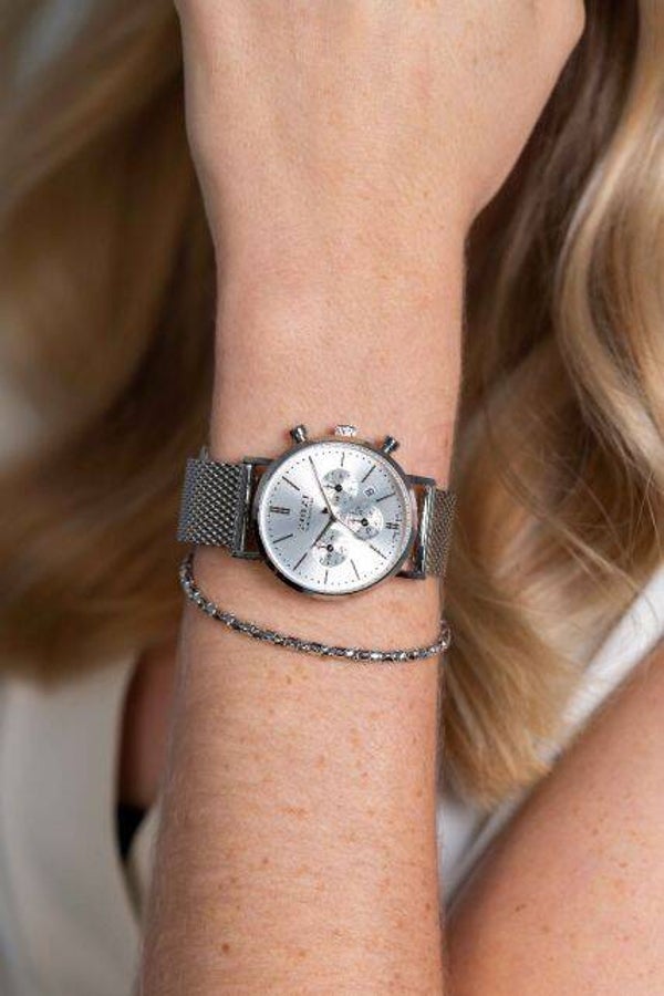 Dit nieuwe sportieve Zinzi Chronometer horloge heeft een elegant formaat (34mm). Met een stalen zilverkleurige ronde kast en op de zilverkleurige 'sunray' wijzerplaat sieren 3 chronograph meters. De stopwatch is makkelijk te bedienen en geeft het horloge een stoere uitstraling om de pols. Met datum-aanduiding. Deze Chrono is voorzien van een trendy stalen mesh band in de kleur zilver. Ook 5atm waterbestendig (tegen regen en spatwater) en met sterk mineraal glas.