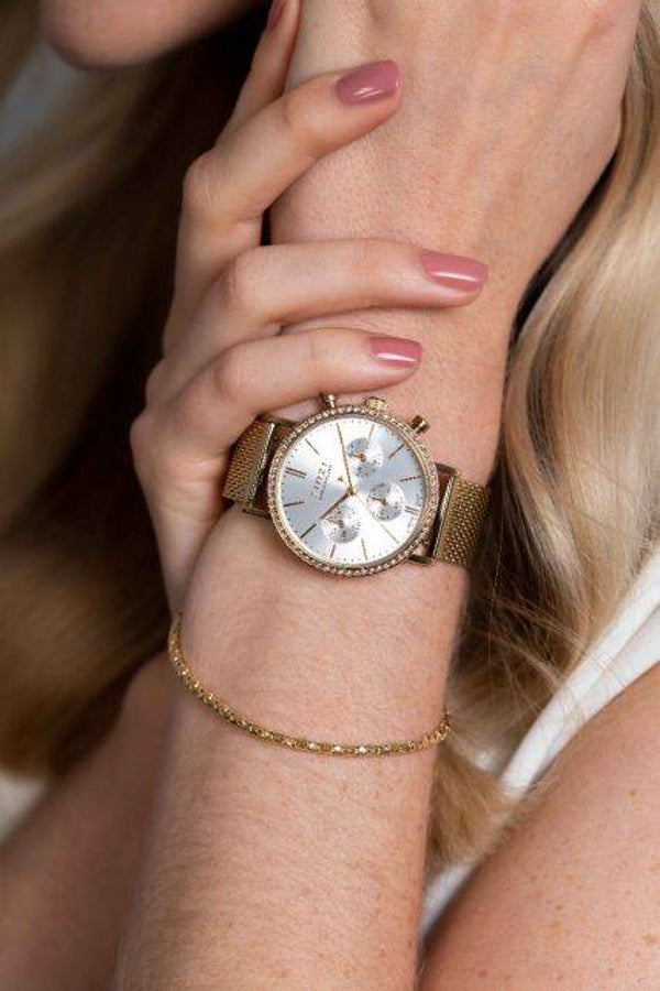 Dit nieuwe Zinzi Chronometer horloge (36mm) is een sportieve eyecatcher. De rand van de geelgoudkleurige ronde kast is bezet met witte crystals en op de zilverkleurige 'sunray' wijzerplaat sieren 3 chronograph meters . De stopwatch is makkelijk te bedienen en geeft het horloge een stoere uitstraling. Deze 'Chrono Grace' is voorzien van een trendy stalen mesh band in de kleur goud. Ook 5atm waterbestendig (tegen regen en spatwater) en met sterk mineraal glas.