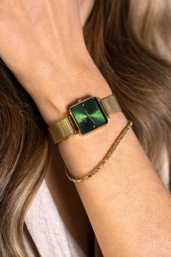Het ZINZI Square Mini horloge is het kleinste vierkante model van de ZINZI horloges. Met zijn geheel geelgoudkleurige stalen kast van 22mm en de groene wijzerplaat oogt dit horloge elegant op iedere pols. Voorzien van een geelgoudkleurige stalen mesh band (12mm breed). Door het mini-model gemakkelijk aan de pols te dragen met meerdere armbandjes.