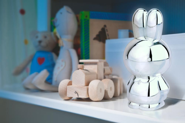 Mooie, glanzende spaarpot in de vorm van het beroemde konijn nijntje. De spaarpot kan gegraveerd worden, wat het een persoonlijk geschenk maakt. Deze nijntje spaarpot is in zilver kleur, poetsen is overbodig. Afmetingen 69x78x148mm.