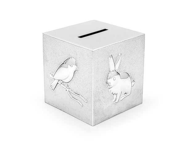 Leuke spaarpot voor de eerste spaarcentjes. De zijkanten zijn voorzien van vrolijke huisdieren. Een leuk kindergeschenk om te geven en om te krijgen. De spaarpot kan gepersonaliseerd worden met een gravure. Afmetingen 85x85x76mm.